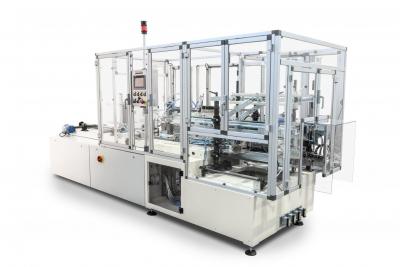 Automatic casepacker for packing bags of long goods into pre-glued cardboard RSC; bags are pushed end-first into cases by pushers. Casepacker complete with double inlet, hot melt gluer or/and taper at outfeed.