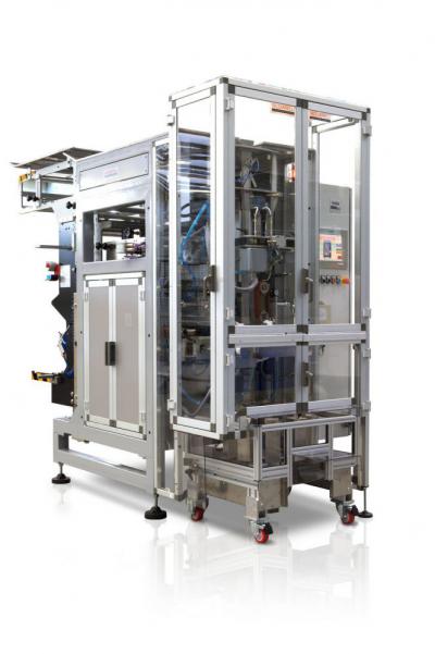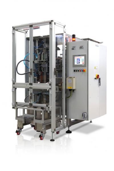 Envasadora vertical form - fill - seal mod. VS70 (sistema de soldadura a mando neumático) y mod. VS100 (sistema di soldadura accionado por motores brushless) en paquetes formados por bobina de film acoplados y red de polietileno, disponible en versión estándar y acero inox. Max velocidad mecánica: 70/100 paquetes al minuto