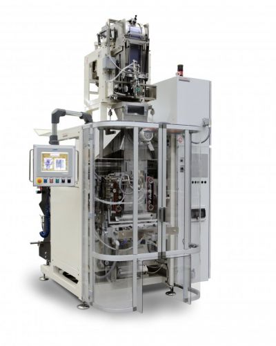 Envasadora vertical form - fill - seal mod. VSCL en paquetes formados por bobina de film acoplado y red de polietileno, disponible en versión estándar y acero inox. Max velocidad mecánica: 70 paquetes al minuto