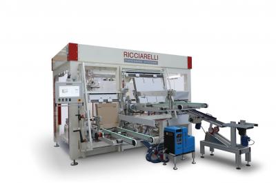 Incartonatrice automatica per sacchetti ed astucci, con inserimento in piedi, in cartoni “wrap-around” composti da vassoio espositore più coperchio.